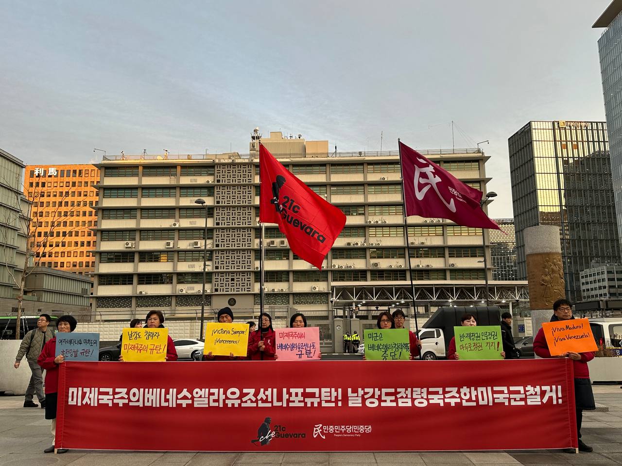 In front of the US embassy in Seoul, the members of the People’s Democracy Party held the demonstration and announced the statement.