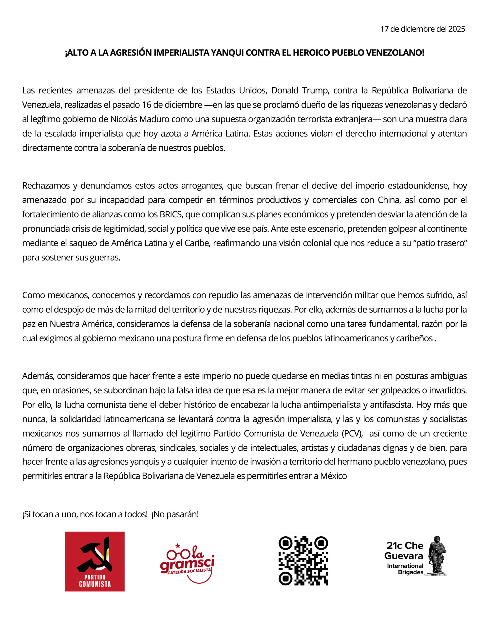 Como mexicanos, conocemos y recordamos con repudio las amenazas de intervención militar que hemos sufrido, así como el despojo de más de la mitad del territorio y de nuestras riquezas. Por ello, además de sumarnos a la lucha por la paz en Nuestra América, consideramos la defensa de la soberanía nacional como una tarea fundamental, razón por la cual exigimos al gobierno mexicano una postura firme en defensa de los pueblos latinoamericanos y caribeños.