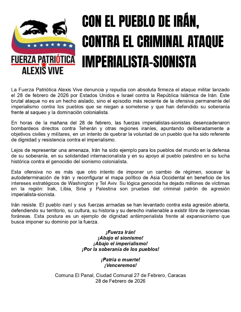 The Patriotic Force Alexis Vive denounces and firmly repudiates the military attack launched on February 28, 2026, by the United States and Israel against the Islamic Republic of Iran. This brutal attack is not an isolated event, but rather the most recent episode in the permanent offensive of imperialism against peoples who refuse to submit and who have defended their sovereignty in the face of plunder and colonial domination.