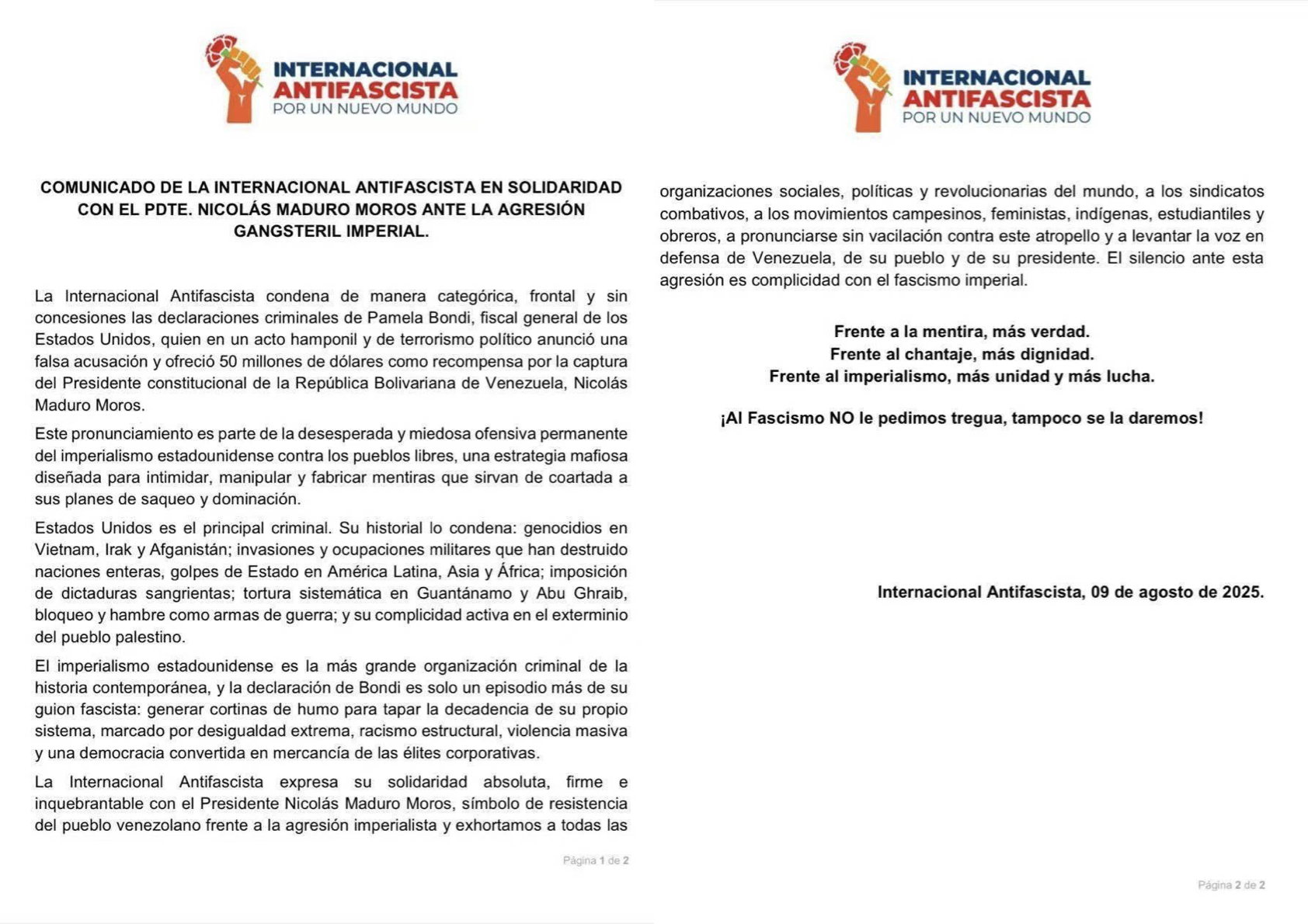 The Anti-Fascist International categorically, directly, and without concessions condemns the criminal statements of Pamela Bondi, Attorney General of the United States, who, in a gangster-like act of political terrorism, announced a false accusation and offered 50 million U.S. dollars as a reward for the capture of the constitutional President of the Bolivarian Republic of Venezuela, Nicolás Maduro Moros.